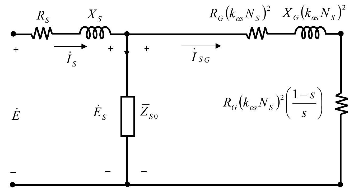 $\quad\left\{\begin{array}{l}\dot{E}=\left(R_{S}+j \omega L_{S d}\right) \dot{I}_{S}+\dot{E}_{S} \\ \dot{E}_{G}=\left(R_{G}+j \omega L_{G d}\right) \dot{I}_{G}\end{array} \quad\left\{\begin{array}{l}\dot{E}_{S}=\mathrm{j} \omega N_{S} K_{a S} \dot{\phi_{S G}} \\ \dot{E}_{G}=\mathrm{j} \omega \dot{\phi_{S G}}\end{array} \Longrightarrow\left\{\begin{array}{l}\tau \cong \frac{E_{S}}{E_{G}}=\frac{N_{S} K_{a S}}{1} \\ \tau \cong \frac{I_{G}}{I_{S G}}=\frac{N_{S} K_{a S}}{1}\end{array}\right.\right.\right.$