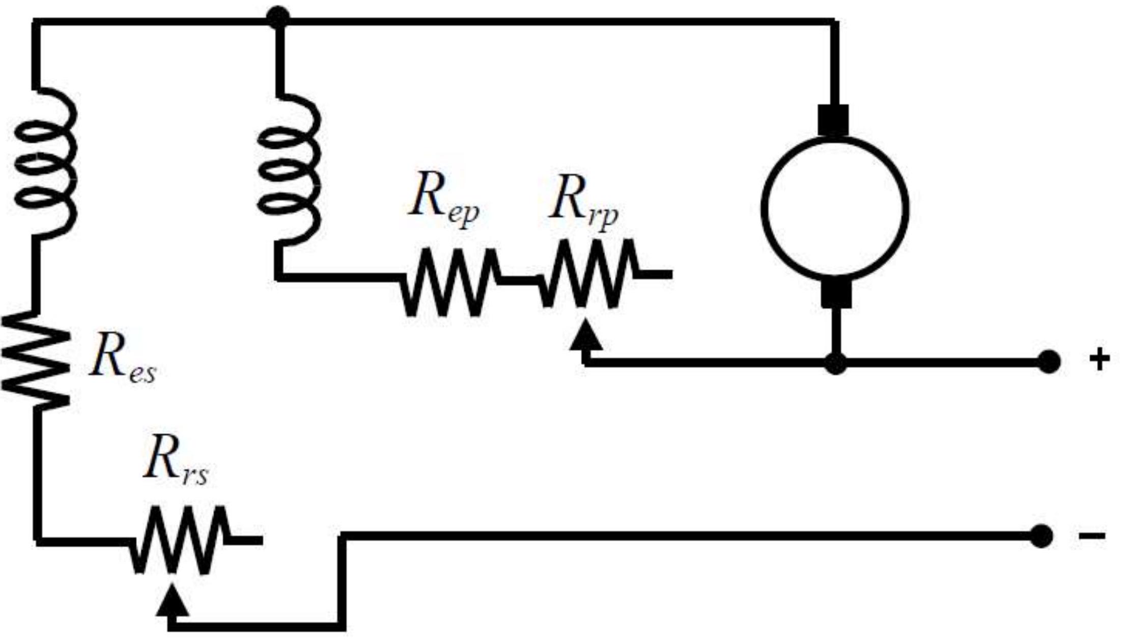 *Schema di principio dell'eccitazione composta. Si notano i due avvolgimenti distinti: uno in serie all'indotto e uno in parallelo, regolabile tramite il reostato $R_r$.*