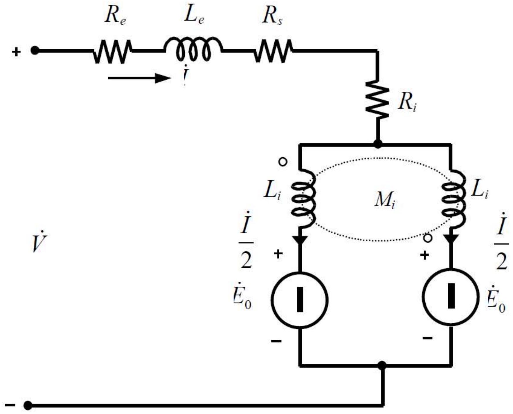 $\color {green} \dot{V} = (R_e + R_s + R_i)\dot{I} + j\omega L_e \dot{I} + j\omega(L_i - M_i)\frac{\dot{I}}{2} + \dot{E}_0$