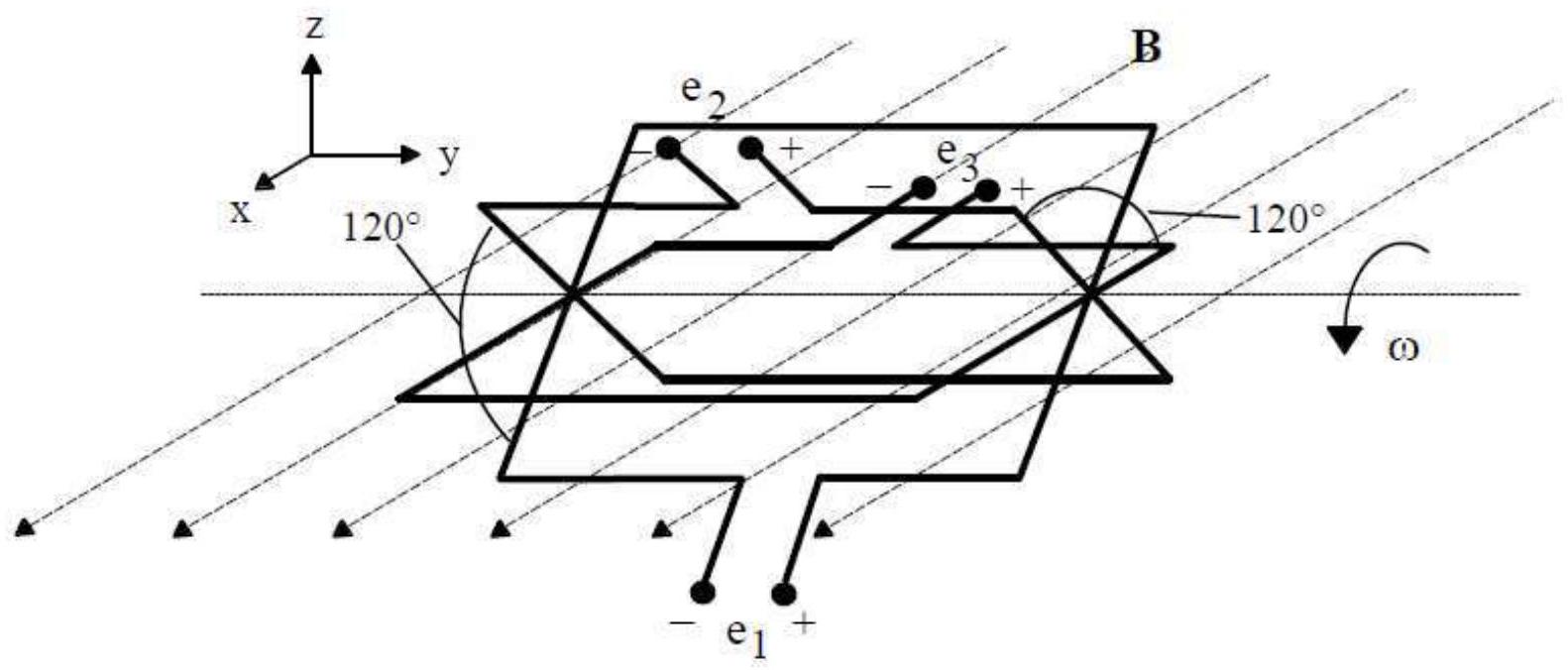 Consideriamo un sistema di tre spire alimentate ciascuna da una componente di un **sistema trifase equilibrato di correnti**