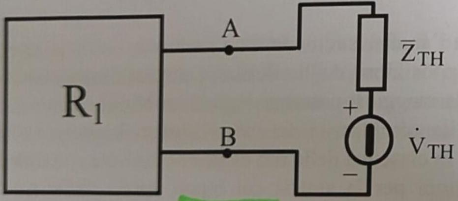 **Allora** si può sostituire ad una delle due reti un **[[Bipoli equivalenti|bipolo equivalente]]**, estremamente più semplice, costituito da una impedenza $\overline Z_{T H}$, detta **impedenza equivalente di Thevenin**, in serie con un generatore ideale di tensione $\mathrm{\dot V}_{\text {TH }}$, detto **generatore equivalente di Thevenin.**